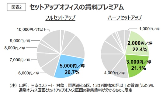 セットアップオフィスは通常オフィスに比べ、内装や什器を備えている分の賃料プレミアムが存在する。都心5区においては、フルセットアップでプラス5,000円/坪が全体の26.7%、ハーフセットアップではプラス 2,000~3,000円/坪が43.5%を占めている。ハイグレードな内装・什器を備え付けた区画では賃料プレミアムが10,000円/坪を超えるケースも少なくない。