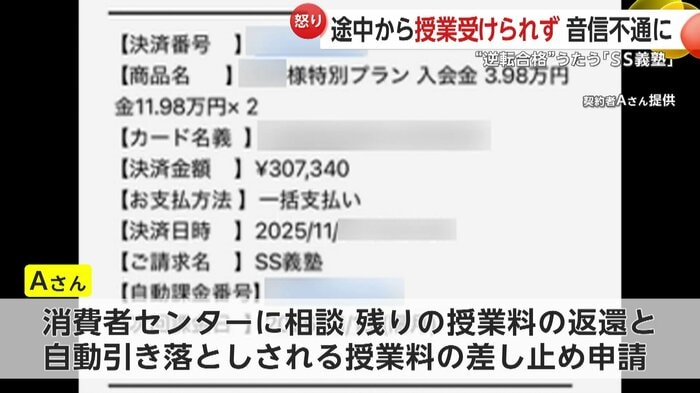 Aさんは消費者センターに相談のうえ、残りの授業料の返還と、自動で引き落とされる次の2カ月分の授業料の差し止め申請を行っているという。