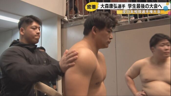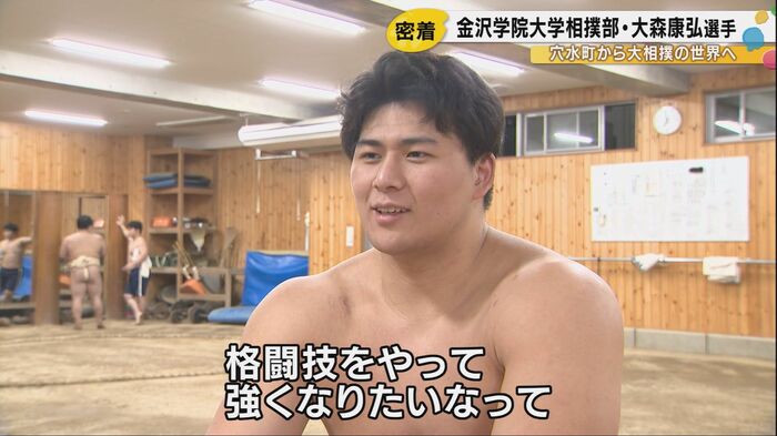 全国大会でも常に上位に入る強豪校、金沢学院大学相撲部。その中でキャプテンを務める大森選手は、学生最後の大会を2日後に控えたこの日も、入念に汗を流していた。