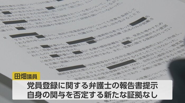 聞き取りで田畑議員は約30分にわたり一連の不祥事について説明。本人に無断で党員登録を行い、企業からの寄付金を党費に充てていたとされる疑惑について、初めて弁護士による調査報告書を提示した。