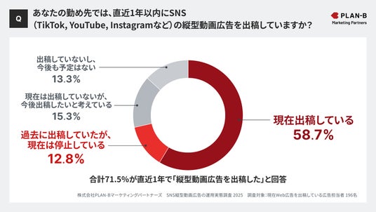 Web広告・SEOなどあらゆるデジタル領域のマーケティング支援を行う株式会社PLAN-Bマーケティングパートナーズ(東京都品川区、代表取締役:鳥居本 真徳)は、現在Web広告を出稿している全国の広告担当者196名を対象に、「SNS縦型動画広告の運用実態調査」を実施しました。