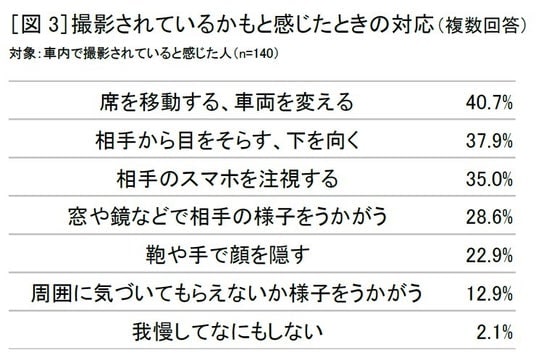 車内で「撮られているかもしれない」と感じたことのある140人にその際の対応について聞くと、「席を移動する、車両を変える」(40.7%)、「相手から目をそらす、下を向く」(37.9%)、「相手のスマホを注視する」(35.0%)、「窓や鏡などで相手の様子をうかがう」(28.6%)、「鞄や手で顔を隠す」(22.9%)などの対応がとられていることが分かりました[図3]。