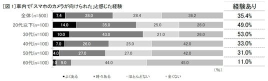 その結果、車内で「他人のスマホのカメラが自分に向けられているかもしれない」と感じた経験がある人は、全体の35.4%でした。また、20代以下は49.0%、30代は53.0%と約半数が「経験がある」と回答し、若い世代ほど他人のスマホのカメラレンズの向きに対する意識が高いことが分かりました[図1]。
