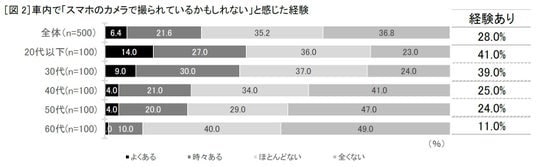 さらに、車内で向かい側にいる人のスマホカメラに対し、「撮られているかもしれない」と不安・不快感を感じた経験について聞くと、「経験がある」と回答した人は28.0%と約4人に1人となっています。年代別では20代以下が最も高く、41.0%が不安・不快感を感じた経験があると答えています[図2]。