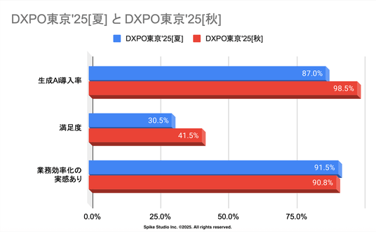 スパイクスタジオがDXPO東京’25[秋]の来場者に実施したアンケートでは、「生成AIを活用している」と回答した方は98.5%に達しました。一方で、興味深いギャップが浮かび上がっています。