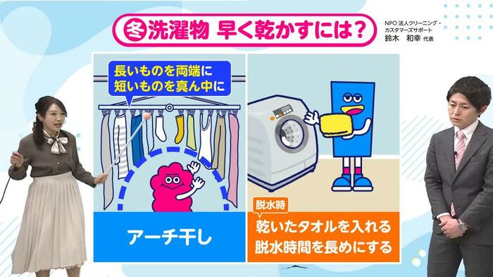 では、乾きにくい冬の洗濯物とどう付き合えばよいのでしょうか。古山予報士は、NPO法人クリーニング・カスタマーズサポートの鈴木和幸代表が推奨する方法を2つ紹介してくれました。