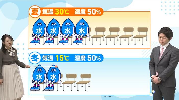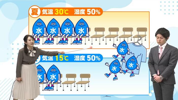 冬の晴れた日は空気がカラカラに乾燥しているイメージがありますよね。ニュースでも「空気が乾燥しているので火の取り扱いに注意してください」という呼びかけをよく耳にします。空気が乾燥しているなら、洗濯物もよく乾きそう!と思いがちですが、実はそうとも限りません。まずは古山予報士から藤崎アナへのクイズから始まりました。