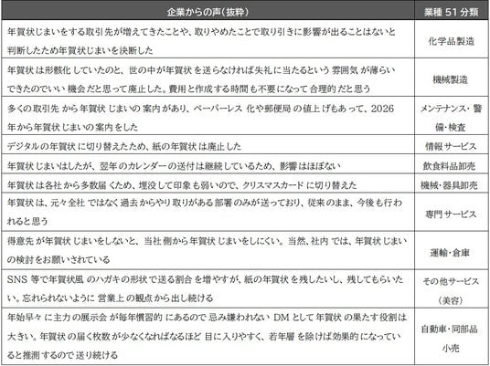 他方、「年賀状じまいはしない」企業は29.0%。また、「年賀状じまい」をしたが再開する「一度送ることをやめたが、2026年(来年)1月分から再開する」企業は0.1%とごく一部でみられた。来年から年賀状を再開する企業を含めると、2026年1月分の年賀状を送る企業は29.1%と3割を下回った。続ける企業としては、慣習のほか、年に一度のあいさつとして関係の浅い取引先に忘れられないように送るなど、営業ツールとして活用しており、「年賀状じまい」が増えるほど年賀状を送ることが効果的になるという見方もあった。