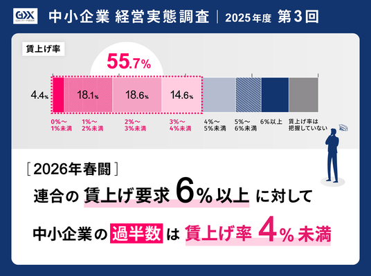政府は、賃上げ支援に向けた政策パッケージを整備し、具体的には補助金や助成金、促進税制、価格転嫁の促進に向けた支援などを進めています。2025年11月28日には、千葉県内で開催された中央委員会で、連合が2026年春季労使交渉(春闘)の賃上げ目標を盛り込んだ闘争方針を正式決定。中小企業の賃上げ率を「6%以上」とする方針として示しました。しかし一方で、これらの政策が現場の経営者にどの程度届き、実際の賃上げに反映されているのかは、依然として明確ではありません。 今回、こうした背景を踏まえ、中小企業における賃上げ状況や取り組みの効果に関する調査を実施しました。
