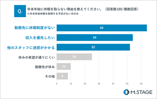 今年の年末年始において、57.8%の医師が休暇を「取得予定あり」と回答する一方で、約4人に1人は「取得予定なし」と回答する結果になりました。「取得予定なし」と回答した医師の休暇を取らない理由としては、「勤務先に休暇制度がない」が最も多く、次いで「収入を優先したい」「他のスタッフに迷惑がかかる」という回答が多い結果となりました。