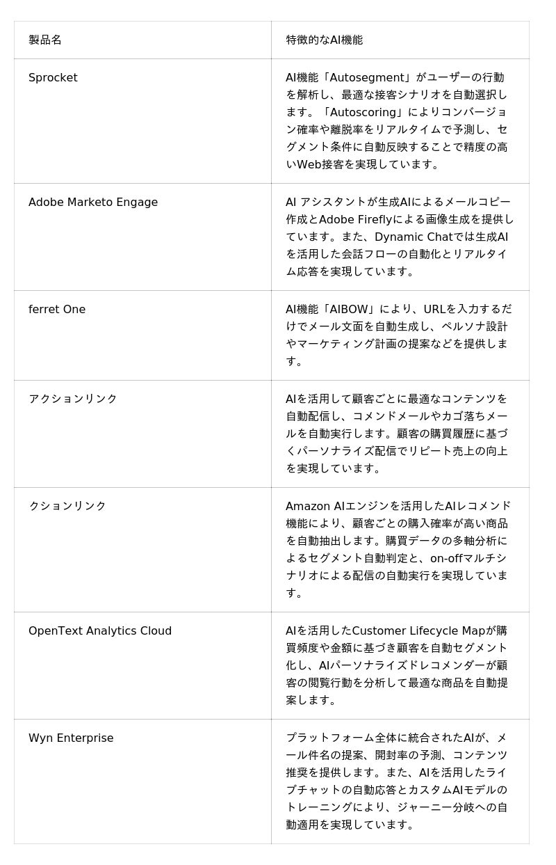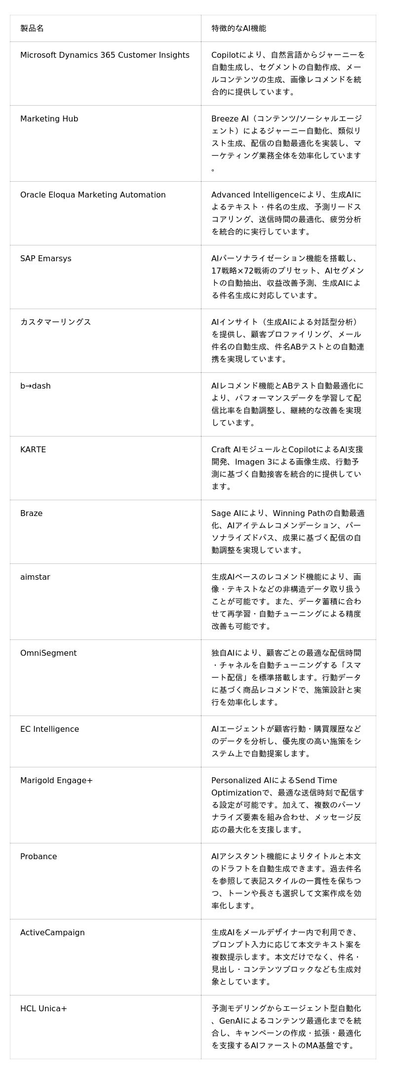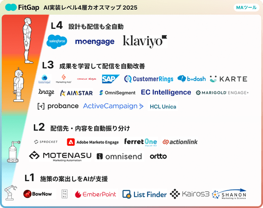 AI機能を持つMAツールは、メール文面の生成やセグメント提案から、配信の自動最適化やキャンペーン自動生成まで、実装レベルが製品によって大きく異なります。本カオスマップは主要31製品を4段階で整理し、各製品がどのレベルまで対応できるかを示しています。「AI機能のレベル」で比較することで、自社のマーケティングニーズに最適な製品を見極める基準がわかります。※本カオスマップは12/16時点の公開情報に基づく客観的な機能分類です。優劣評価ではなく「実装機能の事実整理」を目的としています。