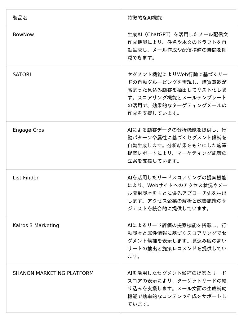 MAツールのAI機能を、施策提案の生成から高度なキャンペーン自動生成まで4つのレベルで分類しています。各製品のAI機能を把握するための評価フレームワークです。評価の前提