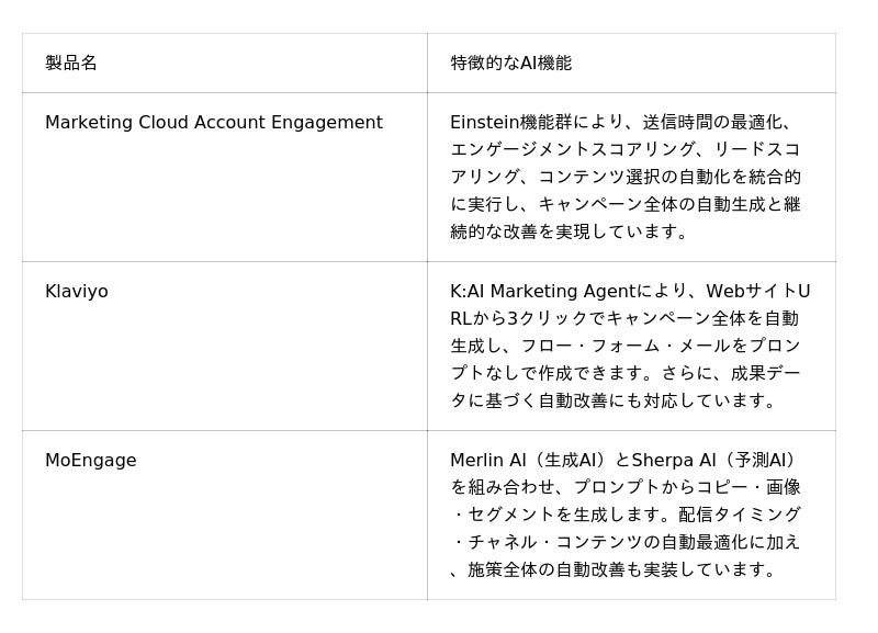 日本のMA市場では、海外製品を中心にL2~L3レベルのAIによる配信最適化や自動学習機能が実装され始めています。特に、メール件名・本文の自動生成や最適送信時間の予測機能が普及し、マーケターの作業負荷軽減に貢献しています。一方で、「設計も配信も全自動」(L4)レベルに到達している製品はまだ限られており、テキスト指示からのキャンペーン自動生成や施策全体の要約機能は、Salesforce Marketing CloudやAdobe Marketo Engageなどグローバル大手が先行している状況です。国内製品においても、「施策の案出しをAIが支援」(L1)機能の実装は進んでおり、メール文面の生成やセグメント候補の提案は多くの製品で利用可能になっています。