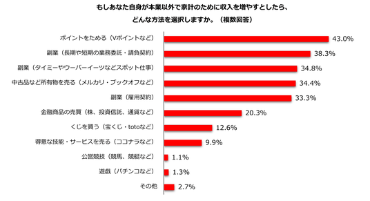 5.収入増やす方法:「ポイントためる」43.0%、「副業(委託・請負)」38.3%
