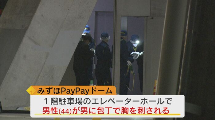 福岡市中央区の『みずほPayPayドーム』1階の駐車場のエレベーターホールで、44歳の男性が男に包丁で胸を刺されたのだ。ブルーシートが張られた場所では、鑑識作業が行われていた。