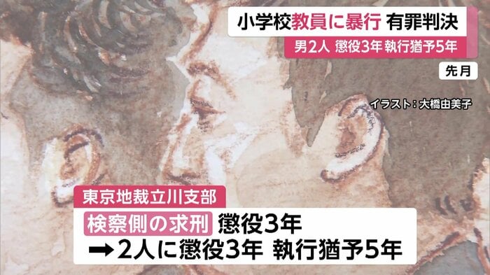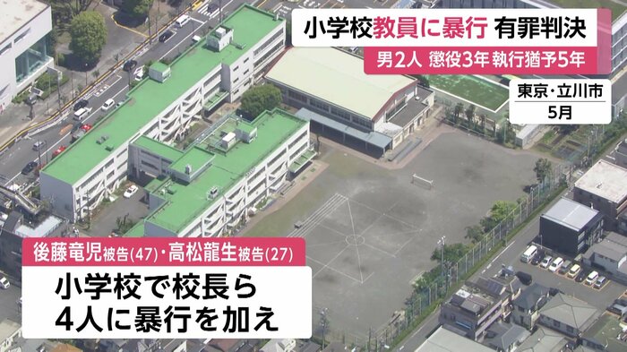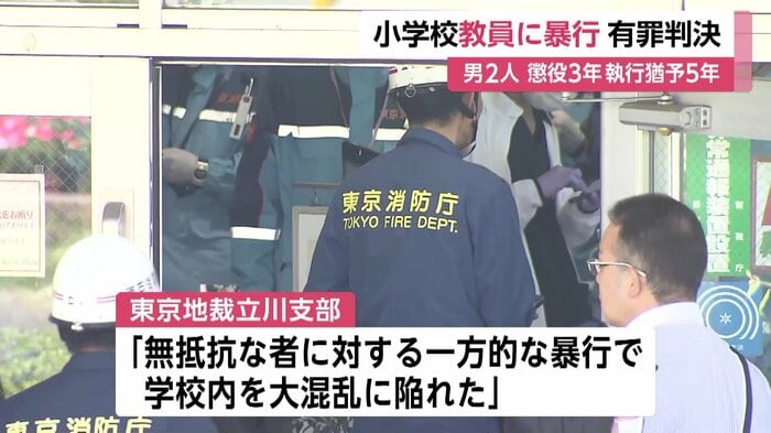 東京・立川市の小学校で2025年5月、校長らを暴行し、けがをさせた罪などに問われている男2人に懲役3年、執行猶予5年の有罪判決が言い渡された。