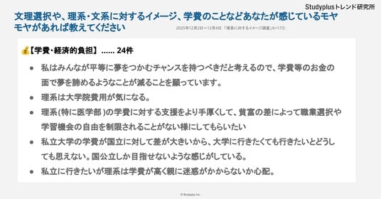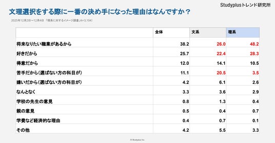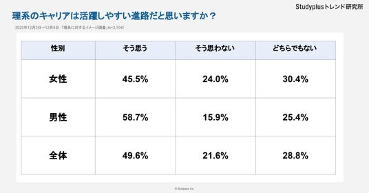 スタディプラス株式会社(本社:東京都千代田区、代表取締役:廣瀬高志、以下スタディプラス)のStudyplusトレンド研究所は、2025年12月2日(火)から12月4日(木)にかけて学習管理アプリ「Studyplus」上で「理系に対するイメージ調査」を実施、3,104名から回答を得ました。本調査は、高校生自身が周囲の環境や経済事情にとらわれず、「学びたいこと」を主体的に追求できる環境づくりを目指し、文理選択の実態と課題を明らかにするために実施したものです。