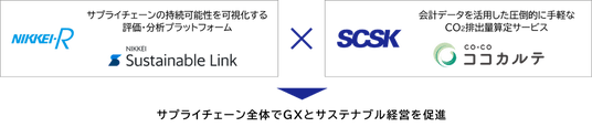 日経リサーチが展開するサステナブル経営評価プラットフォーム「日経サステナブルリンク」と、SCSKが提供するCO2排出量自動算定ソリューション「CO×COカルテ(ココカルテ)」をサービス提携し、両サービスのデータに基づいたサプライチェーンの可視化と改善活動を統合的にサポートします。