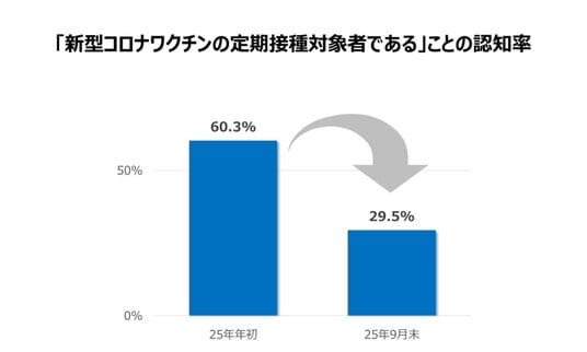 2025年度「新型コロナワクチン定期接種」(以下、2025年度定期接種)が10月1日から開始されました。今年は定期接種2年目に入ったことで、報道や自治体からの広報などが減少し、またインフルエンザの大規模な流行によって、一層注目度が落ちていることが想定されます。そこで、65歳以上の全国男女2500名を対象に、2025年度定期接種の認知率を調べたところ、定期接種の対象者であることを知っている人は、29.5%と、3割を下回る結果となりました。これは、2024年度定期接種の認知率(60.3%)と比べて約半分です。