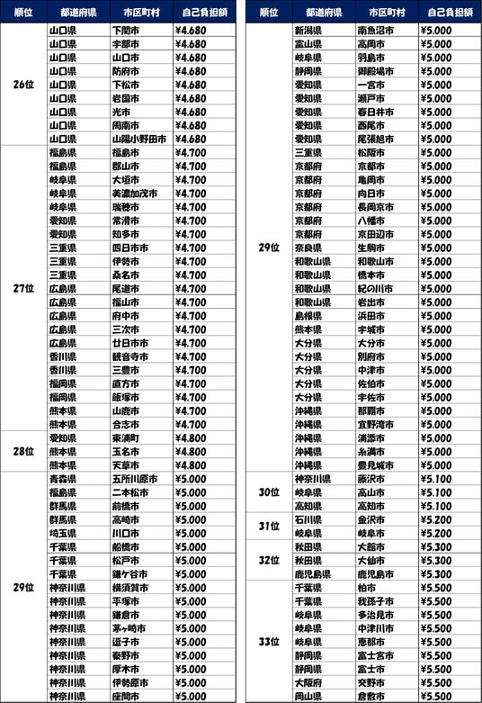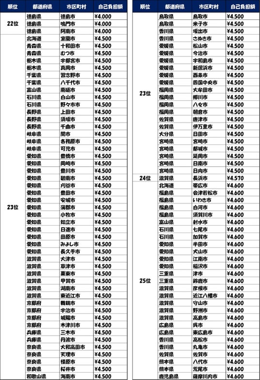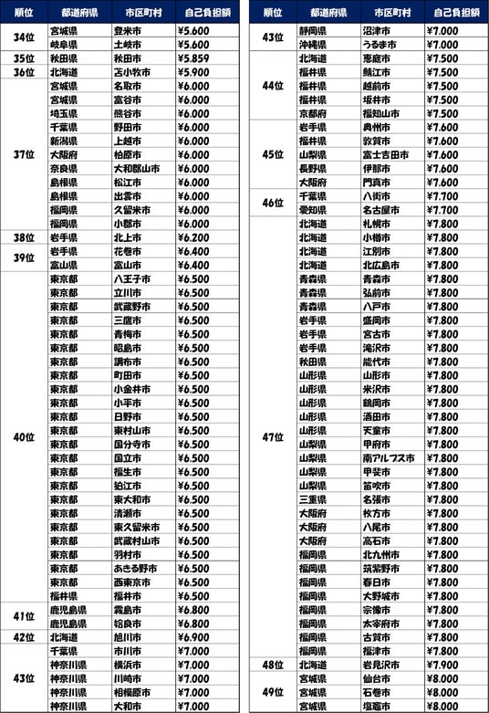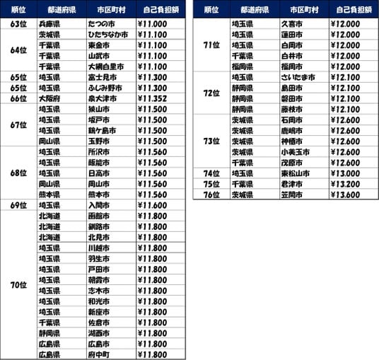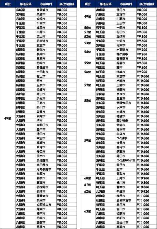 人口5万人以上の549自治体を対象にした自己負担額ランキングの一覧