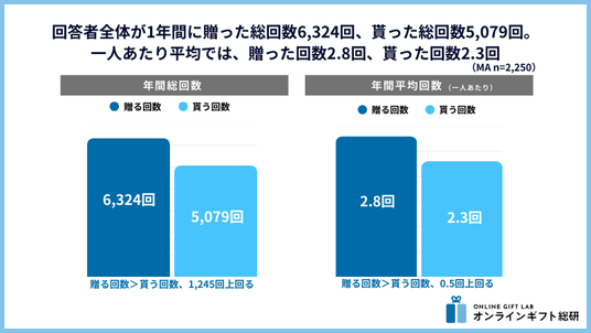 A. 年間総回数では贈った回数(6,324回)が貰った回数(5,079回)を上回っています。年間平均では贈った回数(2.8回)が貰った回数(2.3回)を上回り、全ての性年代で贈った回数が貰った回数を上回る結果となりました。