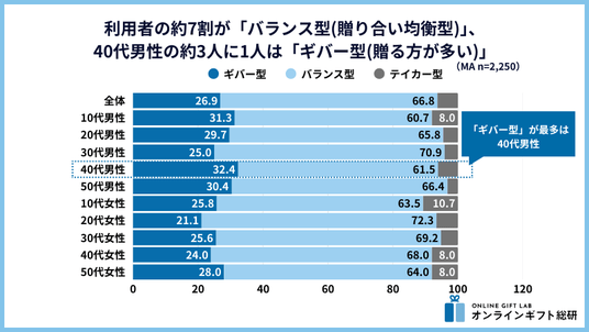 3. 利用者の約7割が「バランス型(贈り合い均衡型)」、40代男性の約3人に1人は「ギバー型(贈る方が多い)」