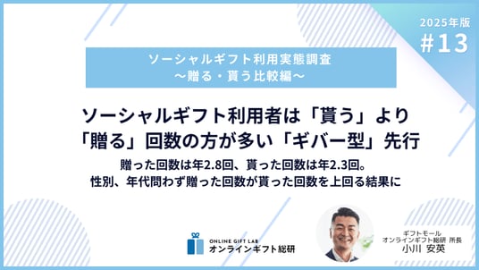 オンラインギフトサービスを通じた幸福度の高い世の中の実現を目指す「ギフトモール オンラインギフト総研」(https://giftmall.co.jp/souken/)は、近年増加する「ソーシャルギフト」の動向を踏まえ、ソーシャルギフト利用経験者に特化した実態調査を実施いたしました。全国の15歳~59歳の男女、合計2,250人(2024年7月からの1年間にギフト購入経験があり、ソーシャルギフトを贈った・受け取った経験がある人)を対象とした本調査の結果を、全16回にわたって順次発表するレポートのうち本レポートは第13回目の発表となります。