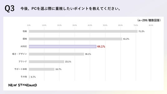 保護者が重視するPC選択基準では、従来最も重要とされてきた「性能(71.2%)」、「価格(61.2%)」に続き、「AI対応」が44.1%で第3位に浮上しました。