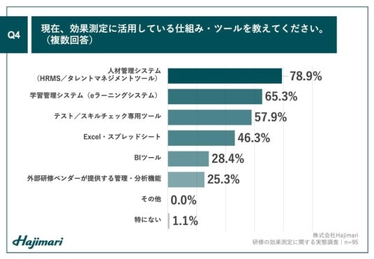 「Q4. Q1で「十分にできている」「ややできている」と回答した方にお聞きします。現在、効果測定に活用している仕組み・ツールを教えてください。(複数回答)」(n=95)と質問したところ、「人材管理システム(HRMS/タレントマネジメントツール)」が78.9%、「学習管理システム(eラーニングシステム)」が65.3%、「テスト/スキルチェック専用ツール」が57.9%という回答となりました。