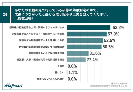 「Q6. Q1で「十分にできている」「ややできている」と回答した方にお聞きします。あなたのお勤め先で行っている研修の効果測定の中で、成果につながったと感じる取り組みや工夫を教えてください。(複数回答)」(n=95)と質問したところ、「研修後の行動変容を上司・同僚からフィードバック」が63.2%、「研修前後でのスキルテスト・理解度テストの実施」が57.9%、「受講ログや動画視聴データを活用した分析」が52.6%という回答となりました。