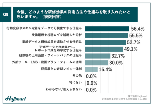 「Q9. 今後、どのような研修効果の測定方法や仕組みを取り入れたいと思いますか。(複数回答)」(n=110)と質問したところ、「行動変容やスキル定着をデータで可視化できる仕組み」が56.4%、「受講履歴や視聴ログを活用した分析」が55.5%、「業績データと研修成果を連動させる仕組み」が52.7%という回答となりました。