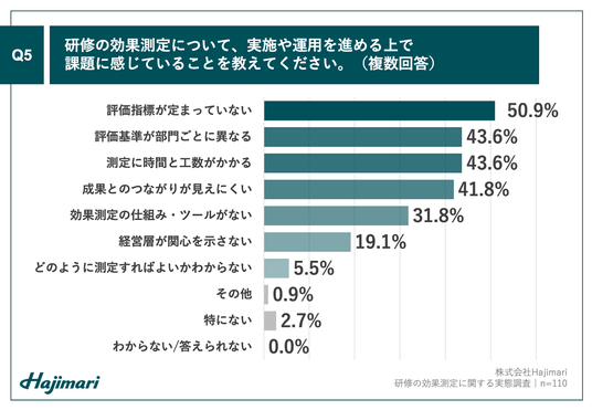 「Q5. 研修の効果測定について、実施や運用を進める上で課題に感じていることを教えてください。(複数回答)」(n=110)と質問したところ、「評価指標が定まっていない」が50.9%、「評価基準が部門ごとに異なる」が43.6%、「測定に時間と工数がかかる」が43.6%という回答となりました。