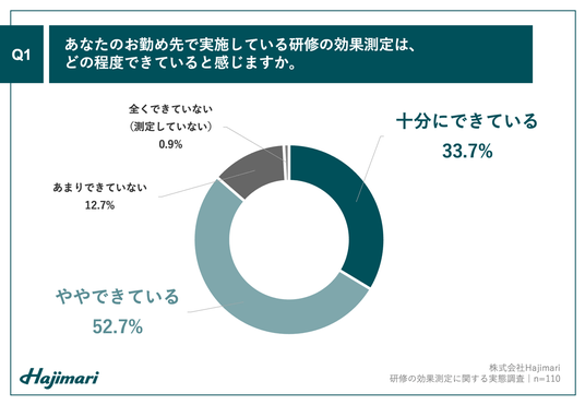 「Q1. あなたのお勤め先で実施している研修の効果測定は、どの程度できていると感じますか。」(n=110)と質問したところ、「十分にできている」が33.7%、「ややできている」が52.7%という回答となりました。