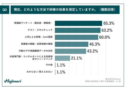 「Q3. Q1で「十分にできている」「ややできている」と回答した方にお聞きします。現在、どのような方法で研修の効果を測定していますか。(複数回答)」(n=95)と質問したところ、「受講後アンケート(満足度・理解度)」が65.3%、「テスト・スキルチェック」が63.2%、「上司による評価・1on1面談」が60.0%という回答となりました。