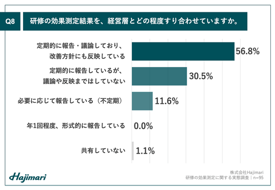「Q8. Q1で「十分にできている」「ややできている」と回答した方にお聞きします。研修の効果測定結果を、経営層とどの程度すり合わせていますか。」(n=95)と質問したところ、「定期的に報告・議論しており、改善方針にも反映している」が56.8%、「定期的に報告しているが、議論や反映まではしていない」が30.5%という回答となりました。