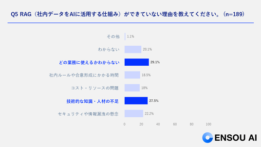 RAGが導入できていない理由を尋ねる設問への回答では、1位が「どの業務に使えるか分からない」で29.1%、2位が「技術的知識・人材の不足」で27.5%、3位が「セキュリティ面の懸念」で22.2%という結果になりました。