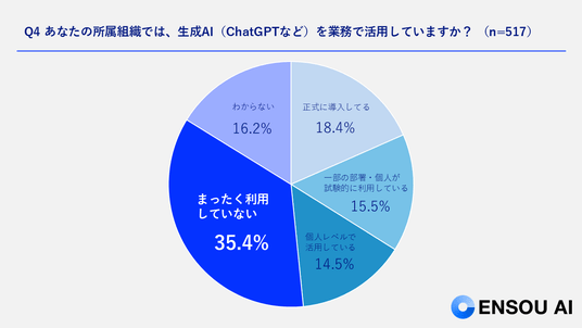 企業における生成AI活用状況について尋ねたところ、「まったく利用していない」が35.4%で最も多く、次いで「正式に導入している」(18.4%)、「一部の部署・個人が試験的に利用」(15.5%)と続きました。