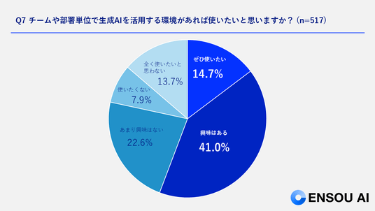 チームや部署で生成AIを活用する意向については、「ぜひ使いたい」が14.7%、「興味はある」が41.0%となり、約56%が「環境さえ整えば使いたい」と回答しました。