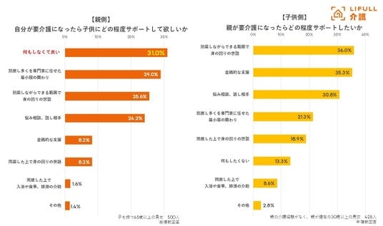 親と子それぞれに親が要介護になった際の子供によるサポートの内容について聞いたところ、親側は自身へのサポートについて求めるものとして「何もしなくて良い」(31.0%)が最も多く 、次いで 「別居し多くを専門家に任せた最小限の関わり」(29.0%)となりました 。一方、子供側がしたいサポートは 「別居しながらできる範囲で身の回りの世話」(36.0%) 、 「金銭的な支援」(35.3%) 、「悩み相談・話し相手」(30.8%) が上位となり、 「何もしたくない」はわずか13.3% にとどまりました。