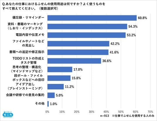・ふせんの主な用途は「備忘録」「資料マーキング」「伝言メモ」など日常業務に密着。