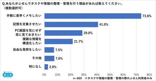 ・ふせん利用の最大の理由は「手軽に素早くメモしたい」7割強。