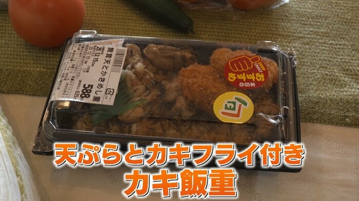スーパーで購入した、天ぷらとカキフライ付きのカキ飯重。お値段は635円。