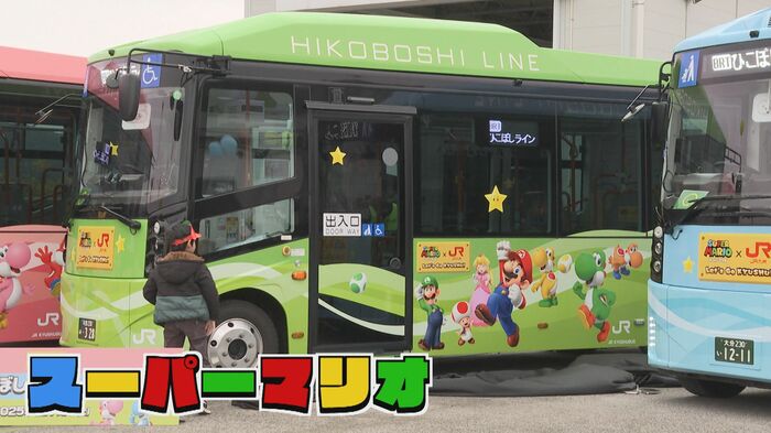 合図とともに幕が外れ、姿を現したのは、人気ゲーム『スーパーマリオ』のキャラクターが描かれた『BRTひこぼしライン』のバス、3台だ。