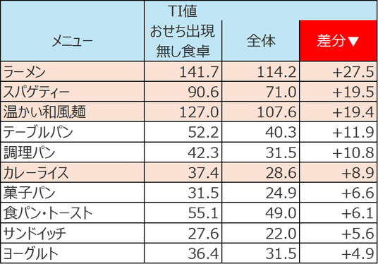 【図表4】分析対象:家族世帯,分析期間:2023~2025年 1/1~3(正月三が日),食卓機会:朝食,指標:TI値(1000食卓あたりの出現回数)、TI値差分