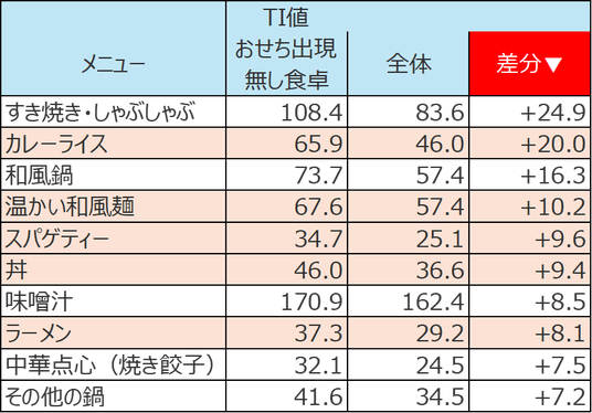 【図表6】分析対象:家族世帯,分析期間:2023~2025年 1/1~3(正月三が日),食卓機会:夕食,指標:TI値(1000食卓あたりの出現回数)、TI値差分