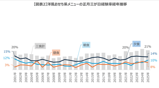 【図表2】分析対象:家族世帯,分析期間:2001~2025年 1/1~3(正月三が日),食卓機会:三食計、朝食、昼食、夕食,分析メニュー:おせちメニュー(洋風),指標:分析メニュー経験世帯率