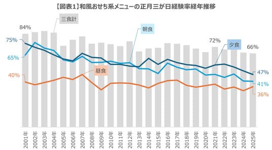 【図表1】分析対象:家族世帯,分析期間:2001~2025年 1/1~3(正月三が日),食卓機会:三食計、朝食、昼食、夕食,分析メニュー:おせちメニュー(和風),指標:分析メニュー経験世帯率