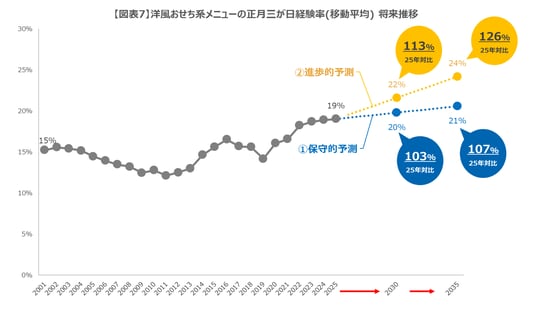 今回分析した洋風おせち経験世帯率は、2025年比で5年後の2030年に103%~113%、10年後の2035 年に2025年比107%~126%と増加の予測です。