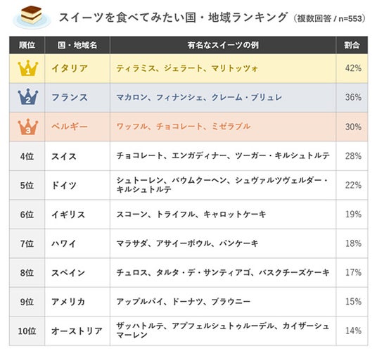 その土地ならではの魅力が詰まったスイーツは、海外旅行の楽しみのひとつ。日本でも人気のティラミスやマカロン、ワッフルといった各国のスイーツを本場で味わう体験は、忘れられないひとときとなります。阪急交通社では、「スイーツを食べてみたい国・地域」に関しての調査を実施。注目の結果を、ランキング形式で紹介します。