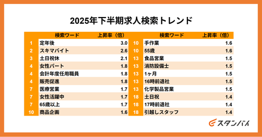 株式会社スタンバイが運営する求人情報一括検索サイト「スタンバイ」(https://jp.stanby.com/)は、2025年6月1日~2025年11月30日に仕事探しに使用された検索ワードをもとにした「2025年下半期求人検索トレンド」を発表します。